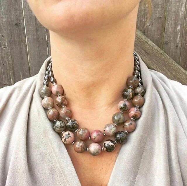 A beautiful double strand of 16 mm uniquely special rhodonite is complimented by sterling silver and hematite beads.