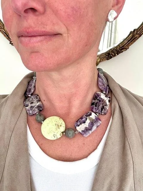 Large sized, multi patterned chevron amethyst, melds together perfectly with 16mm labradorite, lemon turquoise (a form of serpentine), hematite, sterling silver beads, spacers and ornate toggle closure.
